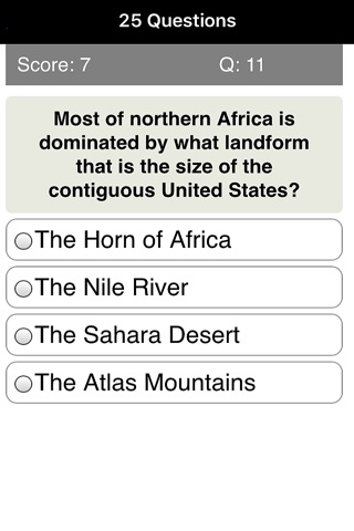 You can choose to answer 10, 25 or 500 questions. The questions will be randomized so that each time you take the quiz (for example 25 questions) you will get a different set of questions. At the end of the quiz, you will be shown the total number you got correct and your percentage score.