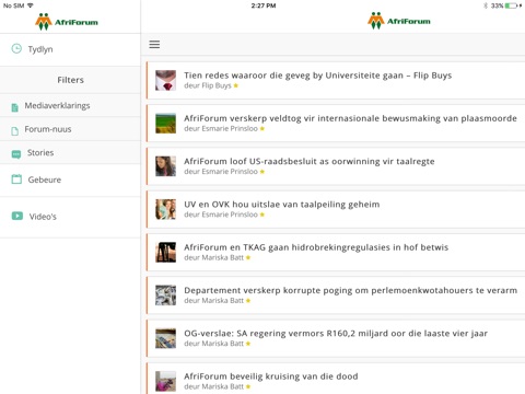 Ons nuusafdeling Forum Nuus hou jou op hoogte van nuus wat met jou, AfriForum en die Afrikanervolk verband hou, onder andere artikels wat in ons Forum-tydskrif verskyn (en hier dus vinniger beskikbaar is!). Ander afdelings nooi jou uit om stories van ander AfriForum-lede uit die perd se bek te lees, terwyl ons gebeureblad jou op hoogte hou van gebeure in en om die AfriForum-wêreld.