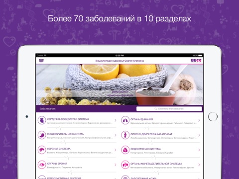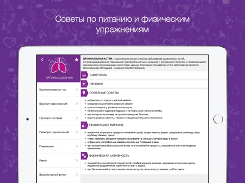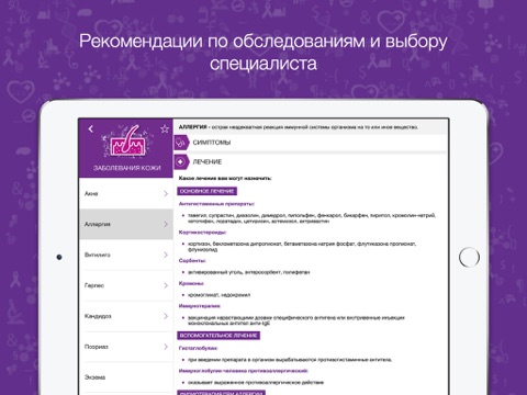 Интерактивный путеводитель по заболеваниям имеет обширную базу данных, удобный интерфейс и важную для слабовидящих опцию увеличения шрифта. Помимо полезной информации о симптоматике болезней, приложение включает в себя советы по улучшению общего состояния здоровья.