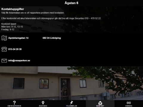 I appen hittar hyresgäster på Ågatan 6, Linköping, information om fastigheten och möjlighet till felanmälan.