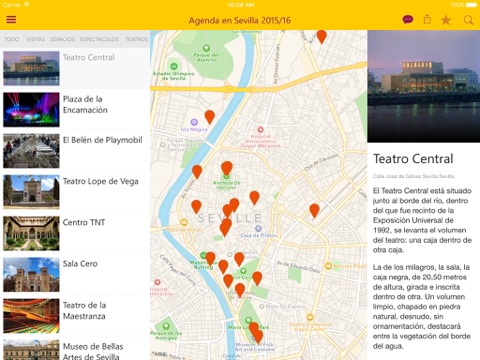 Agenda cultural de Sevilla, donde se podrá consultar gran parte de la programación cultural y espectáculos que se desarrollan en la ciudad. Mapas de localización para poder llegar sin perderte y acceso a las redes sociales donde compartir comentarios y fotos.