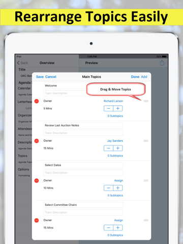3. Add Topics, including sub-topics, presenter/owner(s), and allotted time