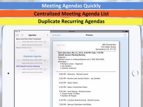 +++ Create professional looking agendas and meeting schedules simply and quickly. Keep your meetings organized, on time, and on topic with this handy utility and intuitive interface. Many customizable options – from formatting to sorting, topics/sub-topics, allotted time, presenter and owners, and more! +++