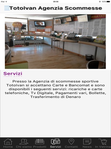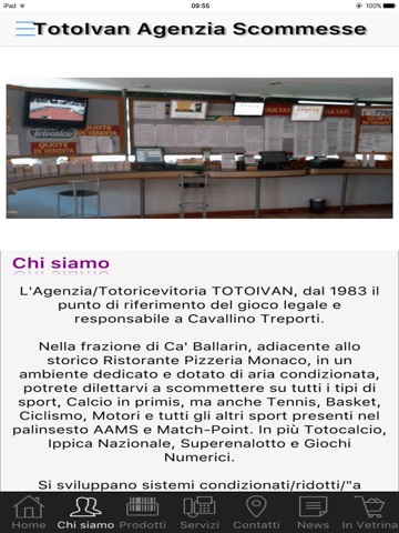 Questa App ti fa entrare virtualmente in un ambiente dedicato e dotato di aria condizionata in cui ci si puo dilettare a scommettere su tutti i tipi di sport, Calcio in primis, ma anche Tennis, Basket, Ciclismo, Motori e tutti gli altri sport presenti nel palinsesto AAMS e Match-Point. In più Totocalcio, Ippica Nazionale, Superenalotto e Giochi Numerici.