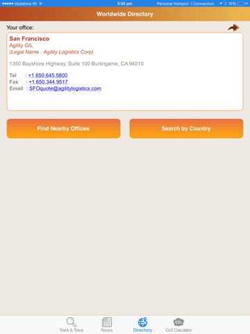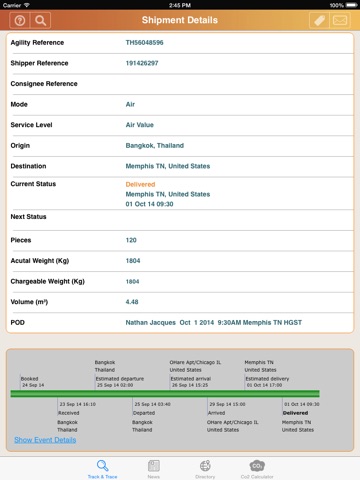 The Agility app lets you track your shipments and stay informed of world events affecting the movement of freight. By entering a reference number, you can quickly get shipment status, view a timeline of events, and tag shipments to receive notifications of shipment status changes. You can monitor world events affecting specific modes of transportation (air, ocean and road) and enable push alerts to be notified of events in real time. Use the app to search Agility’s global network and find offices near you. The app includes a CO2 calculator to estimate the carbon emissions by mode of transport, weight and distance traveled.