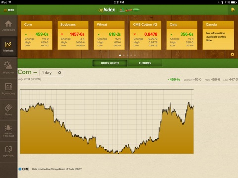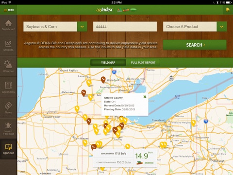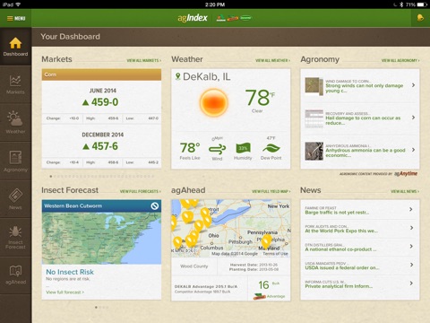 Get all the markets, weather, news and exclusive agronomic advice, in one quick-to-read dashboard. Newest push features agAhead yield trial results. Receive push notifications customized to your location and crop portfolio to keep up with changes in commodity pricing and insect and weather alerts. agIndex turns your smartphone or tablet into a complete agronomic information source, so you can stay fully informed while in the field or on the road. Brought to you by Asgrow®, DEKALB® and Deltapine® seed brands.