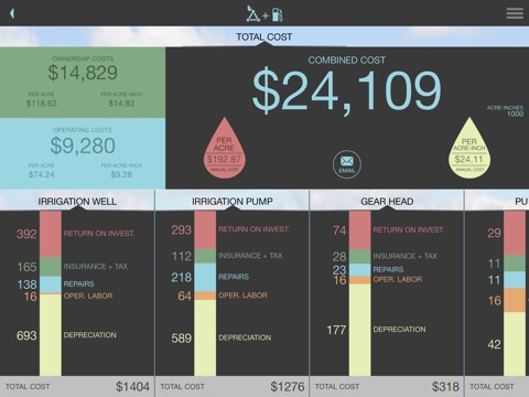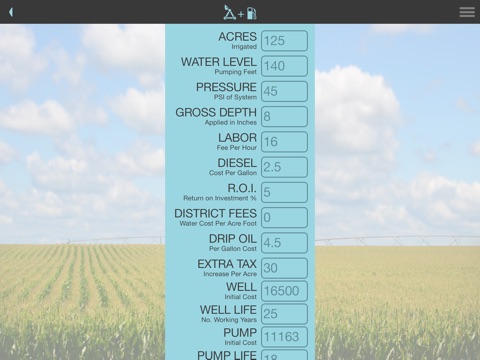 The IrrigateCost app models center pivot and gated pipe irrigation systems and the most commonly used energy sources on separate tabs making side to side comparisons between alternatives possible.