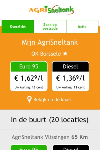 Gebruik de locatie van uw telefoon of zoek op postcode om de dichtstbijzijnde AgriSneltank te vinden en tank altijd de goedkoopste brandstof!