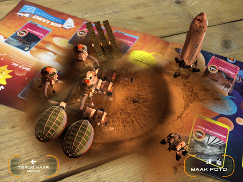 Richt de camera op het plaatje om het plaatje in augmented reality (AR) tevoorschijn te toveren in jouw eigen universum. Als je met je smartphone rustig van je plaatje af beweegt, krijg je steeds meer van de ruimtebestemming te zien. Hoe meer plaatjes je spaart, hoe spannender het wordt en hoe meer je kunt ontdekken. Je kunt ook foto’s maken tijdens je ruimtemissies. Klik in de app op ‘Foto’ en deel deze met je vrienden of familie.
