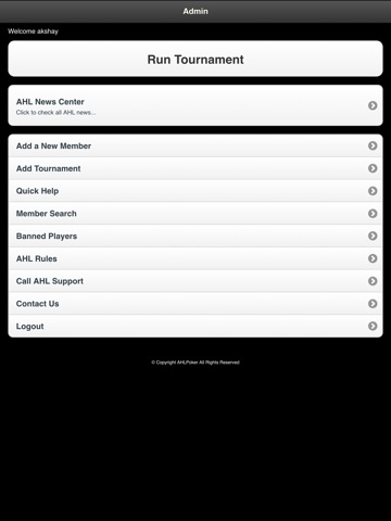 The AHL Poker app is a Texas Hold Tournament software and interface exclusive to AHL Poker. This app will allow approved users to interact with all other AHL software including the live AHL website and full database to run, track, add and monitor AHL Poker tournaments and AHL members.