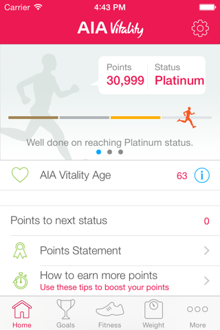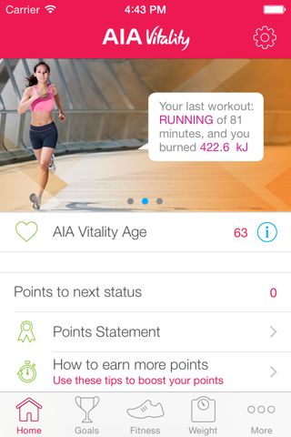AIA Vitality reads your health and fitness data from the Health app (HealthKit) and shows them in a user friendly way, it calculates the calories burnt for activities like walking, biking, swimming, etc. and rewards points based on your exercise.
