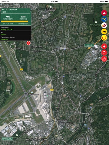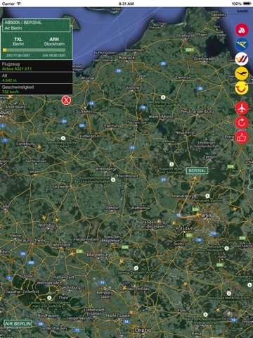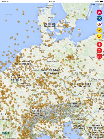 AIR DE lets you view whole flights with 100% correct and instant information. And if you wish, you can push the airports button and switch to another one you want or you can select an airline and view their whole flights in the sky!