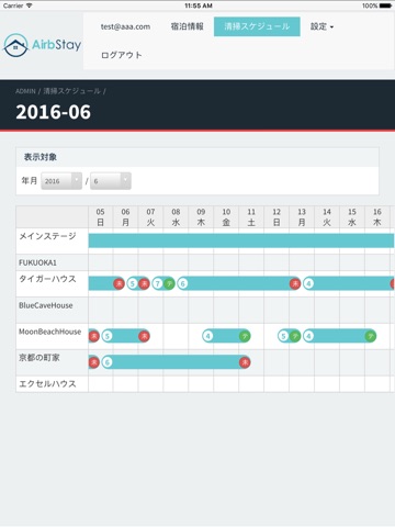清掃カレンダーでは物件ごとに宿泊予定(チェックイン・チェックアウト日)が表示され、清掃員をアサインすることができます。