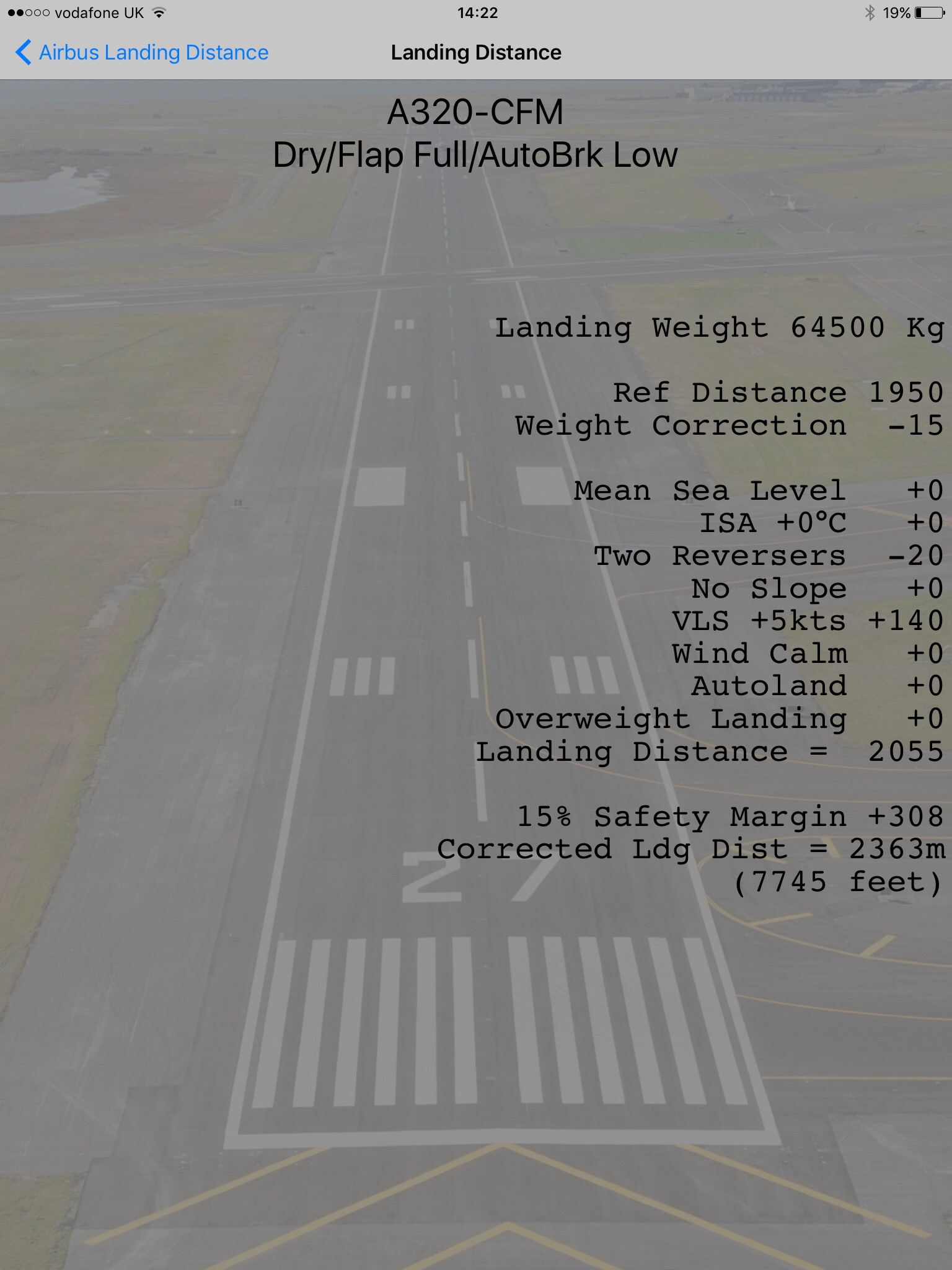 A metric calculator to determine in-flight landing distance for the Airbus A319/320/321 IAE & CFM series aircraft. Please read the following description carefully before purchase . This calculator employs reference distances that apply to standard modification state aircraft. If your airframes vary from standard mod-state then this product may be unsuitable for you. Check the information below carefully before purchase.