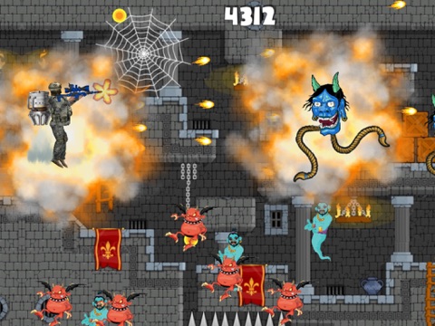 A commando wearing an air-jetpack flies in a jungle and enters a castle fortress infested with demons. Combat action involving modern weapons against ancient evil. Shoot as many demons and Jinns as you can. Fly as far as you can to get high score.