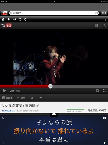 displays lyrics (by character, line, or multiple lines) while you search the website on your smart phone.