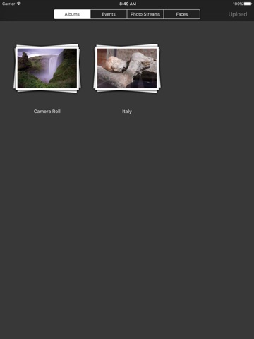 Quickly browse through all of your Albums, Events, Photo Streams, and Faces to pick the photos you wish to upload.