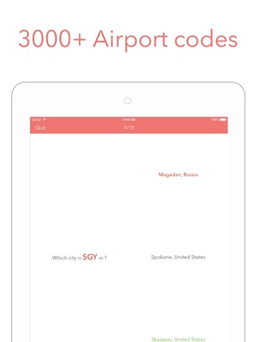 Guess 15 of the most difficult Airport Codes from all over the world. Compete against your friends via GameCenter. See who can guess most codes correctly in the shortest period of time.