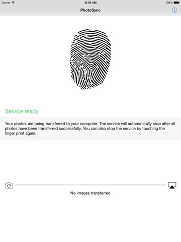1) Touch the fingerprint in the iOS App to start processing. The application prepares itself for sending your photos to the Desktop computer.