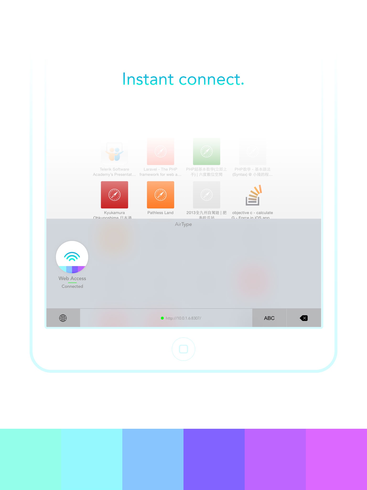 The typing experience just fit your typing habit. Open the AirType Keyboard at your iPhone. Open a web browser, browse to the link displayed on the AirType Keyboard. Type your words in Web Access Portal. Press "Enter/Return" key to make the words appear on your iPhone. Press "Delete" button to delete words on your iPhone. That Simple.