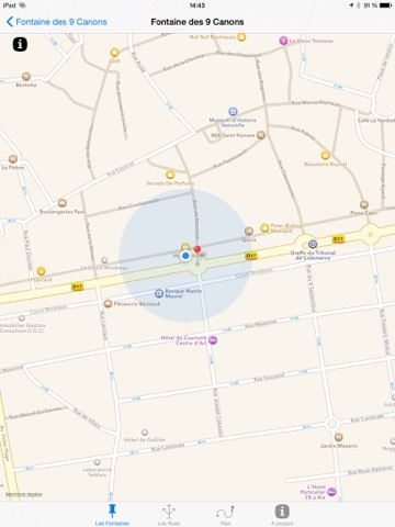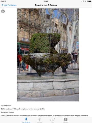 Pour chaque fontaine, il y a une photo ainsi quun texte. Vous pourrez localiser la fontaine sur la carte dAix-en-Provence via "le globle". Le plan affiche la carte dAix-en-Provence avec un drapeau pour la fontaine. Il affiche également votre localisation. A tout moment vous pouvez recentrer la carte soit sur votre position, soit sur la fontaine.