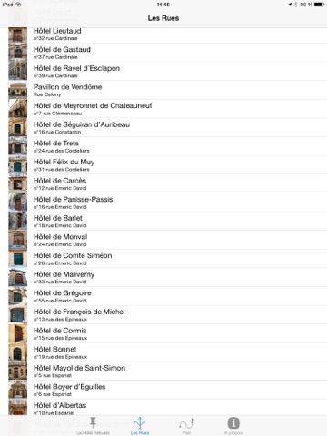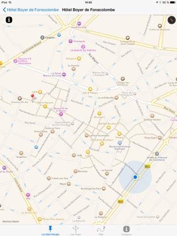 Pour chaque hôtel particulier, il y a une photo et ainsi quun texte. Vous pourrez localiser lhôtel particulier sur la carte dAix-en-Provence via "le globle". Le plan affiche la carte dAix-en-Provence avec un drapeau pour lhôtel particulier. Il affiche également votre localisation. A tout moment vous pouvez recentrer la carte soit sur votre position, soit sur lhôtel particulier.