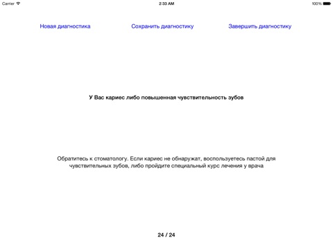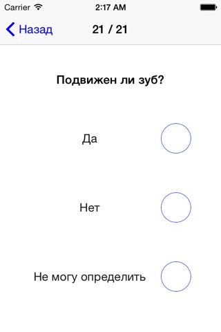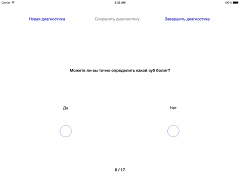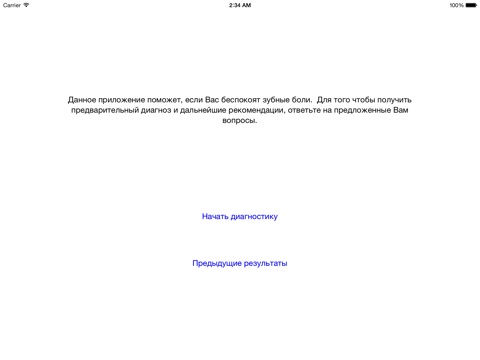 Если Вас беспокоят зубные боли, а возможности попасть к стоматологу нет, то это приложение для Вас. Оно создано при участии высококвалифицированных специалистов. Пользоваться приложением очень просто: ответьте на ряд вопросов, получите предварительный диагноз и дальнейшие рекомендации. Однако помните, что данное приложение не может заменить Вам осмотр и лечение у стоматолога.
