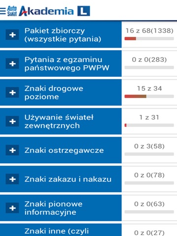 - oficjalne pytania egzaminacyjne z podziałem na kategorie tematyczne,