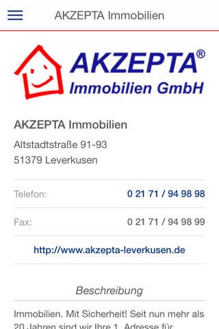 Mit der AKZEPTA Immobilien App finden Sie ausgewählte Immobilien im Raum Leverkusen und einigen weiteren Regionen.