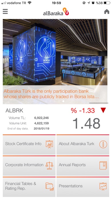 Albaraka Türk’s Investor Relations Application enables users to closely monitor the financial and operational performance of Albaraka Türk on their iPhones and iPads.