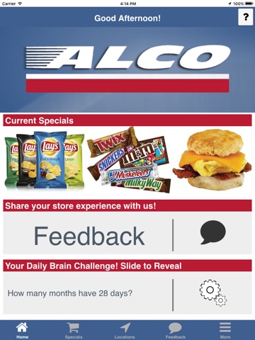 Promotions – Alco works hard to offer exciting specials on the products you purchase frequently. Daily and weekly promotions can now be sent directly to you through push notifications or select promotions within the app to search daily specials.