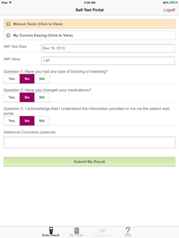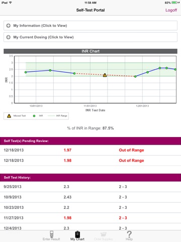 Optimize your anticoagulation therapy by submitting your INR Results and other therapy related information directly to the Alere CoagClinic® Application where it can be reviewed by your clinician or physician. The focus of this app is to allow you to record an INR Result anytime from anywhere based on your clinicís hours of operation for assessment within a clinical setting by a healthcare professional. This app is intended for use by patients who receive a login through a clinic that uses the clinic side of the application to monitor their warfarin (Coumadin) dosing and International Normalized Ratio (INR) / Prothrombin Time (PT) results.