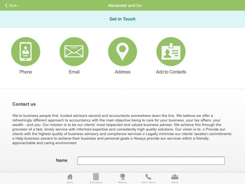 The Alexander & Co App has been designed to be a useful place to get critical information whenever you need it. As always, the team at Alexander & Co is on hand to provide professional, personal advice and guidance. The Finance &Tax App is packed with tools that you and our future clients will love, such as: