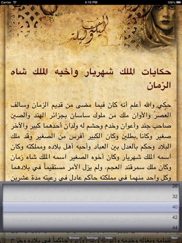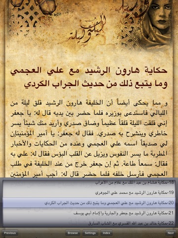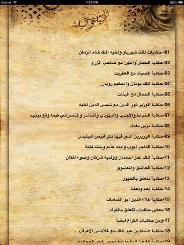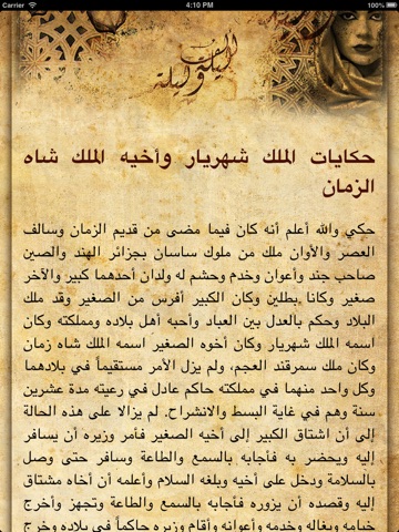 تطبيق ألف ليلة و ليلة الكاملة يقدم الموسوعة الكاملة لاشهر القصص الخيالية العربية المأخوذة من التراث المصري و العراقي و الشامي و حتى التراث الهندي القديم. وتحتوي قصص ألف ليلة وليلة على شخصيات أدبية خيالية مشهورة منها كعلاء الدين، وعلي بابا والأربعين حرامي ومعروف الإسكافي وعلى زيبق المصرى والسندباد البحري، وبدور في شهرزاد وشهريار الملك، والشاطر حسن. و يحتوي هذا التطبيق على النسخة الكاملة بدون حذف