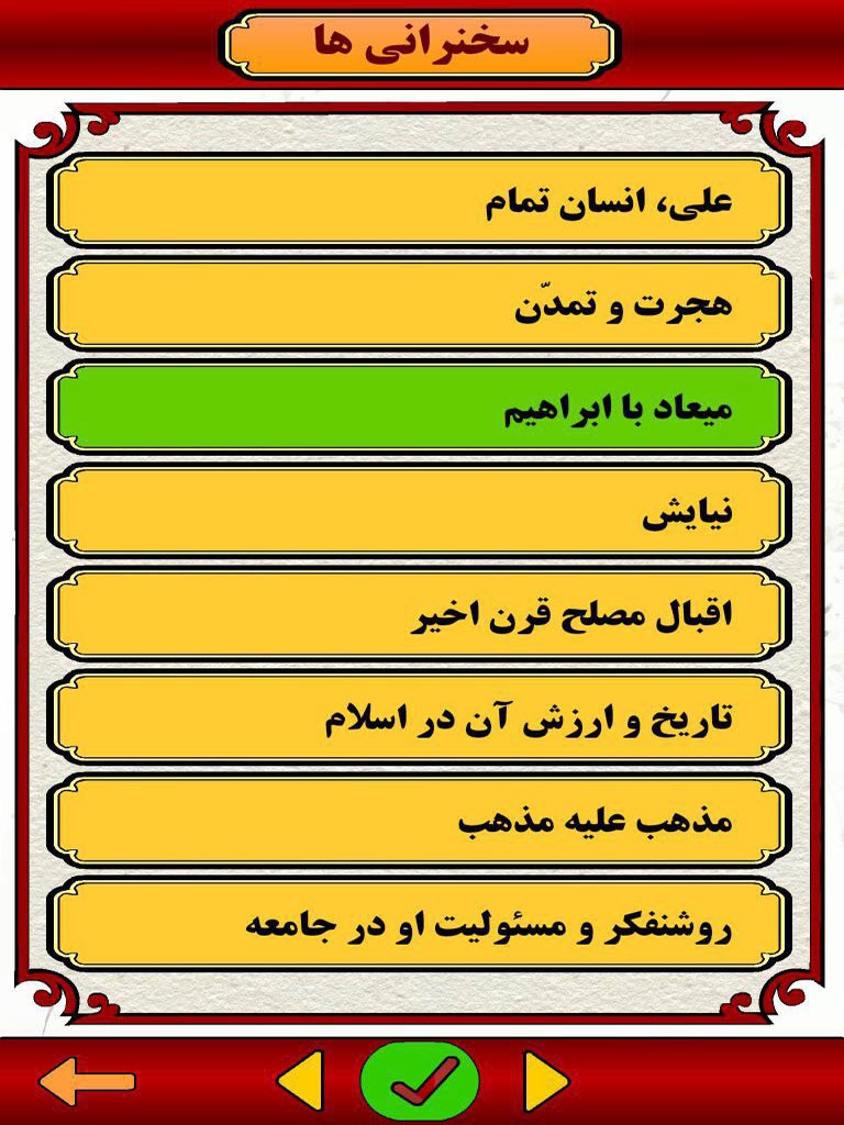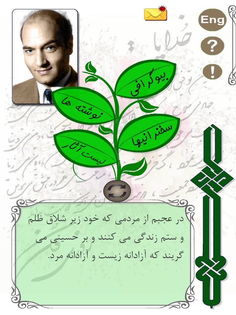 The Application launches with one of Dr Shariati’s famous quotes, and a growing tree with 4 branches (selections):