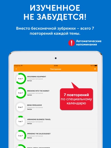 2. После того, как тема будет изучена, для нее будет составлен календарь повторений. Приложение будет предупреждать Вас, когда наступит время очередного повторения. Повторять слова можно устно или письменно. Предусмотрена возможность пропуска слова и удаления его из повторений (если Вы уверены, что выучили его).