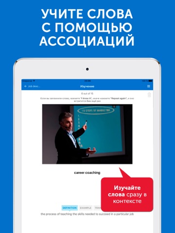 Приложения для изучения английской бизнес-лексики для настоящих профессионалов! С помощью ALIBRA Business Вы сможете значительно пополнить свой словарный запас в области делового английского. Здесь есть все необходимые слова для проведения переговоров, деловых встреч, совещаний, собеседований. Телефонные переговоры, деловая переписка, создание презентаций на английском, чтение специализированной литературы и зарубежной периодики – все это больше не будет для вас проблемой!