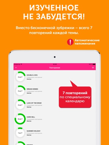 2. После того, как тема будет изучена, для нее будет составлен календарь повторений. Приложение будет предупреждать Вас, когда наступит время очередного повторения. Повторять слова можно устно или письменно. Предусмотрена возможность пропуска слова и удаления его из повторений (если Вы уверены, что выучили его).