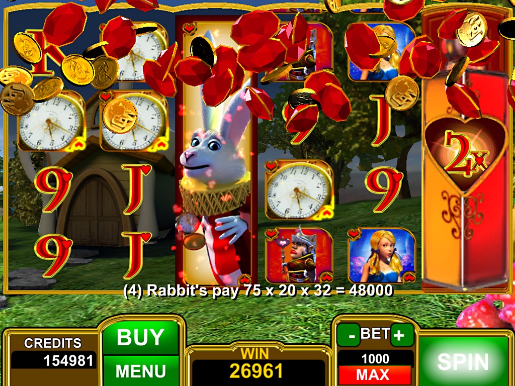 Each bet spins all reels, with bets starting at 50 credits up to 1,000,000 credits. There are multiple base game features: rabbit hole symbol shuffle, Out of Time Feature, dropping wilds, stacked feature symbols. The bonus games include a trip down the rabbit hole and a free spin bonus with WILD symbols and Free Spin Retriggers. Game plays out with aggressive volatility. All of our games use real math and true industry standard random number generation for maximum Las Vegas excitement. This free version allows the player to play for free. Every day you receive 1 or more free wheel spins which allows you to win credits to play on the game. You can also watch videos for additional credits. Additional game credits are also available for purchase. Note - This game is strictly for fun only and does not allow real world gambling.