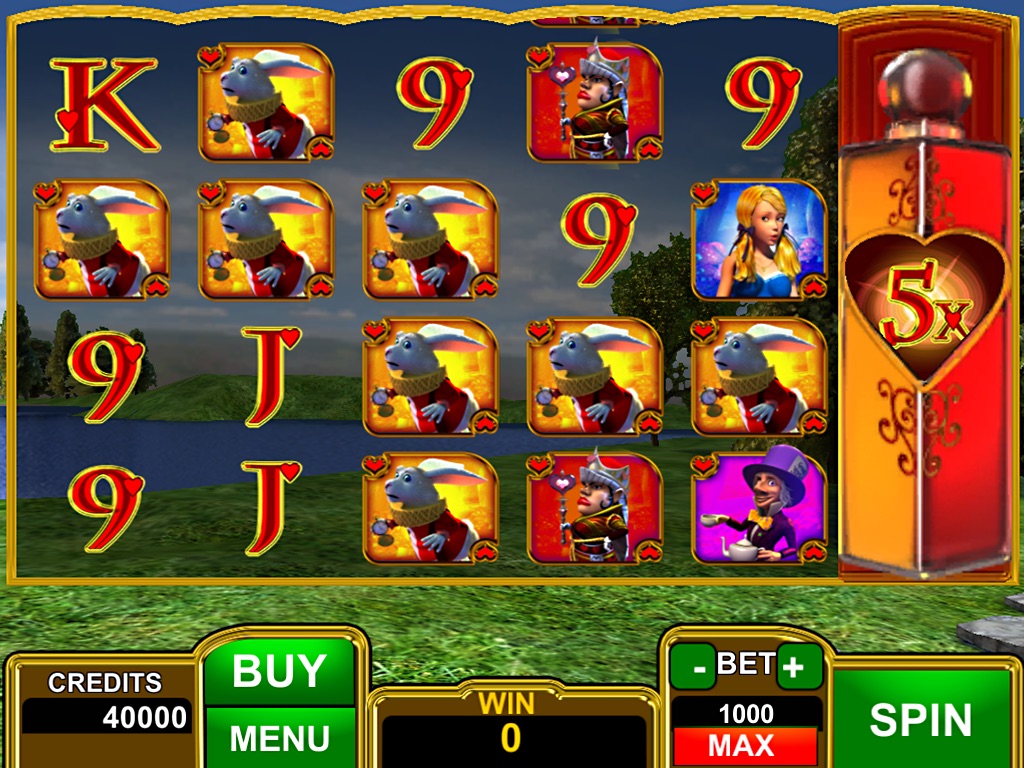 Alice Gold Wonderland Slots is an "Alice in Wonderland" themed, 6x4 Video Slot Game featuring bet-able reels that allows over 1000 ways to pay. This game, as well as all of our games are strictly "for fun only" and simulate a real slot machine experience.