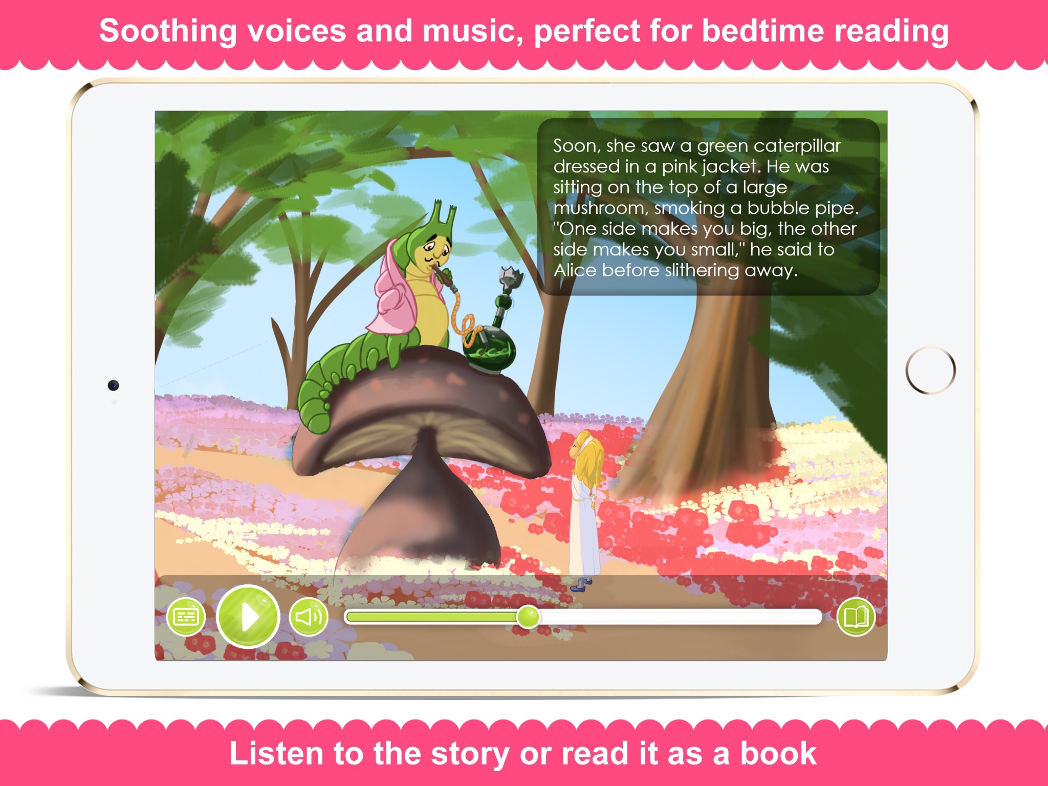 "Read to me" and "Read me a story" are the two sentences, which parents hear the most at bedtime. Alice in Wonderland is just one of the stories you can find in our app Tales with GiGi ( Download Here: http://go.taleswithgigi.com/itunesIT ). It is an invaluable present for your child, because it has everything a storytelling app for kids should - a collection of over 25 children’s books titles with original Grimms fairy tales, classic Aesop’s fables and modern stories.