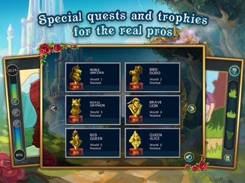 Alice’s Patchwork 2 is a game of mosaic puzzles made of 6 different materials: wood, cloth, glass, paper, precious stones and metal. Assemble patchwork puzzles and guess the picture: a garden with talking flowers, a crazy tea party, cards come to life, the riddles of Humpty Dumpty, a duel between the Lion and the Unicorn, the intrigues of the Red Queen, a meeting with the White Rabbit… What other wonders await you in these 6 worlds? Put together all the mosaics and help Alice transform from a pawn into a queen!