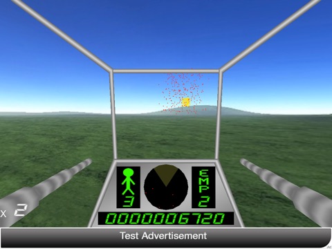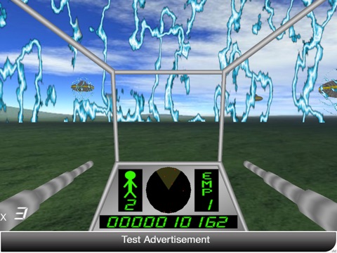 A 3D action game. Youre manning a rotating turret armed with laser cannons and an EMP generator. UFOs swarm all around. Shoot them before they reach the turret!