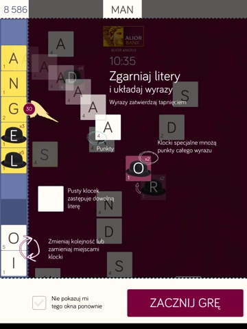 Zgarniaj spadające litery i układaj z nich słowa. Pamiętaj, że pobrane litery możesz przestawiać i zamieniać miejscami. Układając wyrazy zawierające litery A L I O R zgarniasz dodatkowe bonusy.