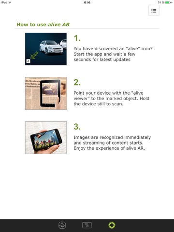 Scan the page or the object with the alive app and experience a new dimension of entertainment. The app is recognizing the image and digital contents like videos, 3D-models and more are loaded. The possibilities are unlimited...