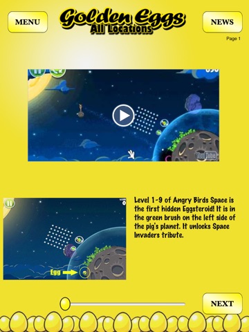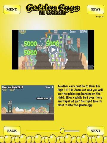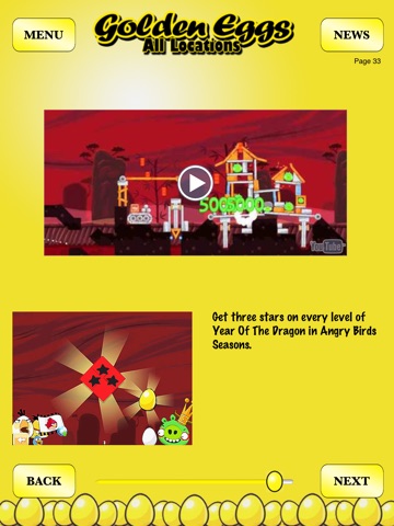 Videos, screenshots, and text descriptions of every location of the infamous Golden Eggs found in the popular game about furious little birds that want to destroy those pesky pigs. Also includes all eggs for the Seasons version: Moon Festival, Christmas, Valentine, St Patricks Day, Halloween and Easter.