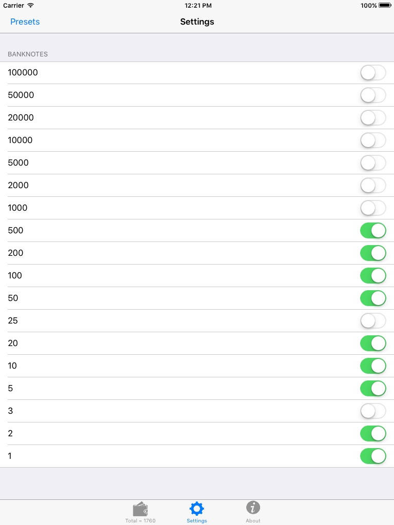 You can select several predefined currencies or customize the banknotes according your choice, your country.