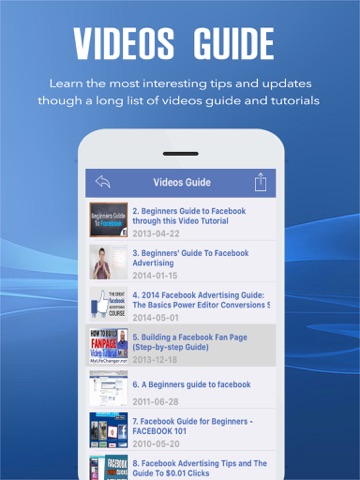 * Videos Guide : Learn the most interesting tips and updates though a long list of videos guide and tutorials for Facebook.