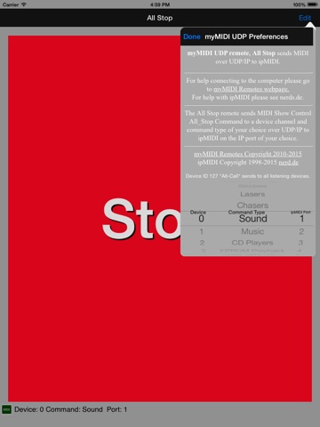 myMIDI UDP remote, All Stop sends MIDI over UDP/IP to ipMIDI. The All Stop remote sends MIDI Show Control All_Stop Command to a device channel and command type of your choice over UDP/IP to ipMIDI on the IP port of your choice. Show control from your iPhone, iPad or Apple Watch. For help connecting to the computer please see www.mymidiremotes.com.