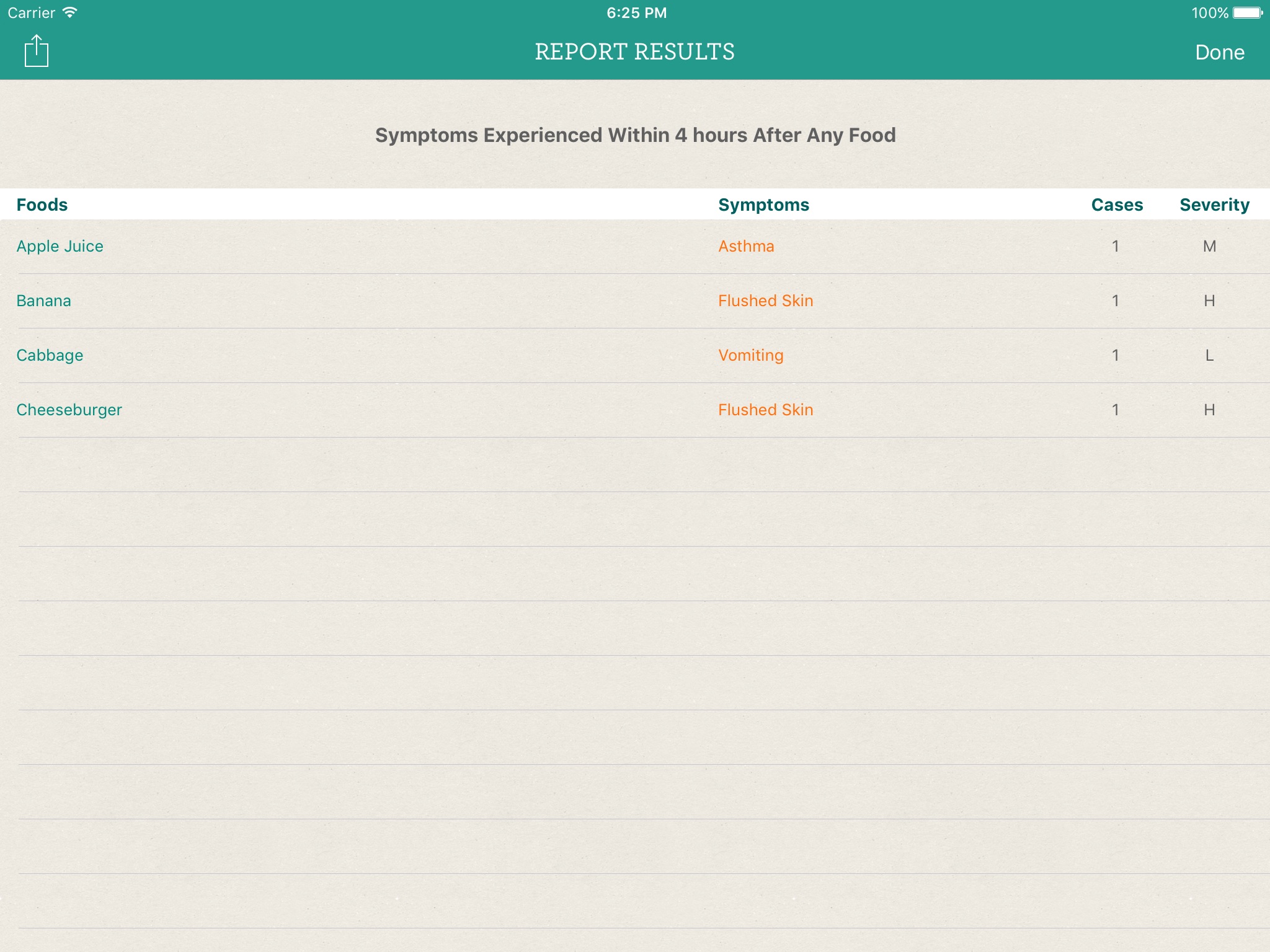 • Report 2: View all foods eaten [#] hours before experiencing [Mild/Medium/Severe] [SYMPTOM]
